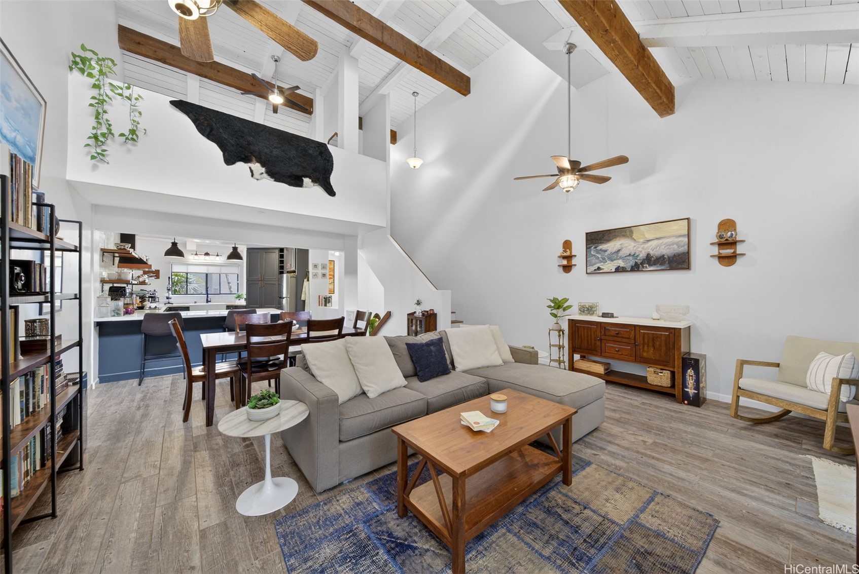 The executive master suite offers commanding ocean views with wood floors and ceilings and a private lanai.